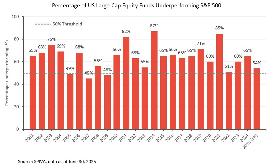 根据 SPIVA 数据统计显示,2025 年上半年,54% 的美国大型股主动基金跑输标普 500 指数。2024 年和 2023 年,这一比例分别为 65% 和 60%。