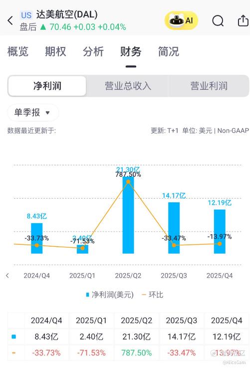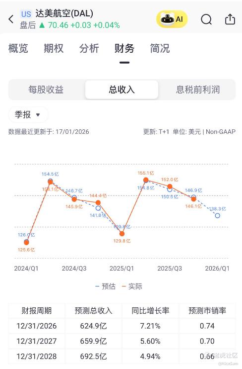 $达美航空(DAL)$ Q42025营业收入为$160.0亿,2025财年营业收入为$633.6亿。单单从收入端来看,他们做到了一个高端+忠诚度+MRO的“60%护城河”。