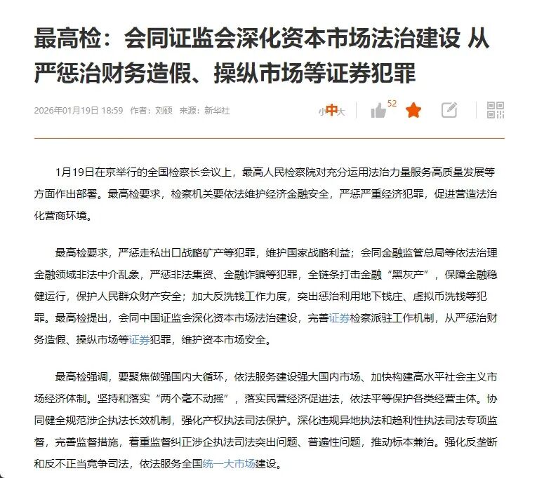 本周监管部门召开2026年度工作会议,明确提到"中长期资金入市取得重要突破,市场呈现回暖向好态势,要巩固稳中向好势头",这表明监管层对资本市场健康发展持坚定支持态度。同时,会议还强调"进一步维护交易公平性,严肃查处过度炒作乃至操纵市场等违法违规行为,坚决防止市场大起大落"。这显示在鼓励市场活力的同时,监管层更注重防范风险、稳定预期。监管"降温"的本质并非让市场情绪"熄火",更不是打压市场,而是挤泡沫、去炒作,引导资金真正流向优质标的,从而实现资本市场健康有序发展。