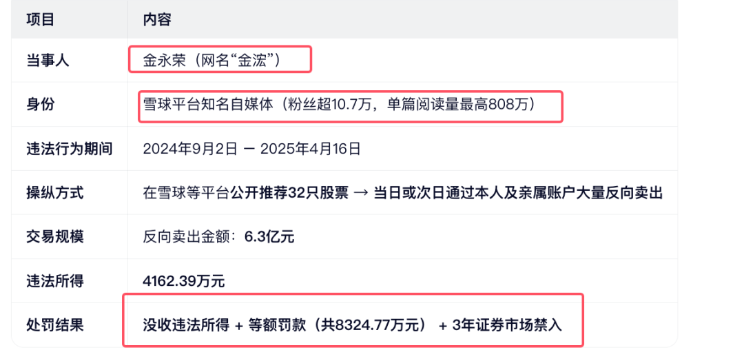 2024年9月2日至2025年4月16日,金永荣知晓其荐股行为具有影响力,在其雪球“金浤”账号公开发文评价、推荐“启迪环境”“路维光电”“光华科技”等32只股票,并控制账户组在荐股后的当日或次日进行大量反向卖出交易。按当日及次日卖出口径计算,交易金额合计630,594,337.30元,违法所得合计41,623,864.21元。