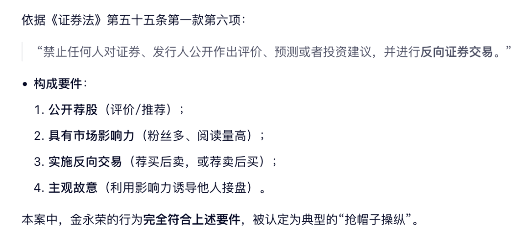 其四,当事人客观交易行为符合“抢帽子操纵”的典型特征。第一,《证券法》第五十五条规定的反向证券交易强调交易方向与荐股方向相反,而非“仅有卖出、没有买入”。本案当事人在荐股后的当日或次日进行大量反向卖出交易,甚至将部分股票在发帖荐股后的十几分钟内清仓卖出,发帖时间与反向交易行为紧密关联,当事人发帖后的买入行为无法阻却对其操纵行为的认定。第二,当事人大量所谓做T交易实质为针对同一只股票反复循环操作“买入—荐股—卖出”,其买入卖出时机与荐股发帖时间紧密关联。