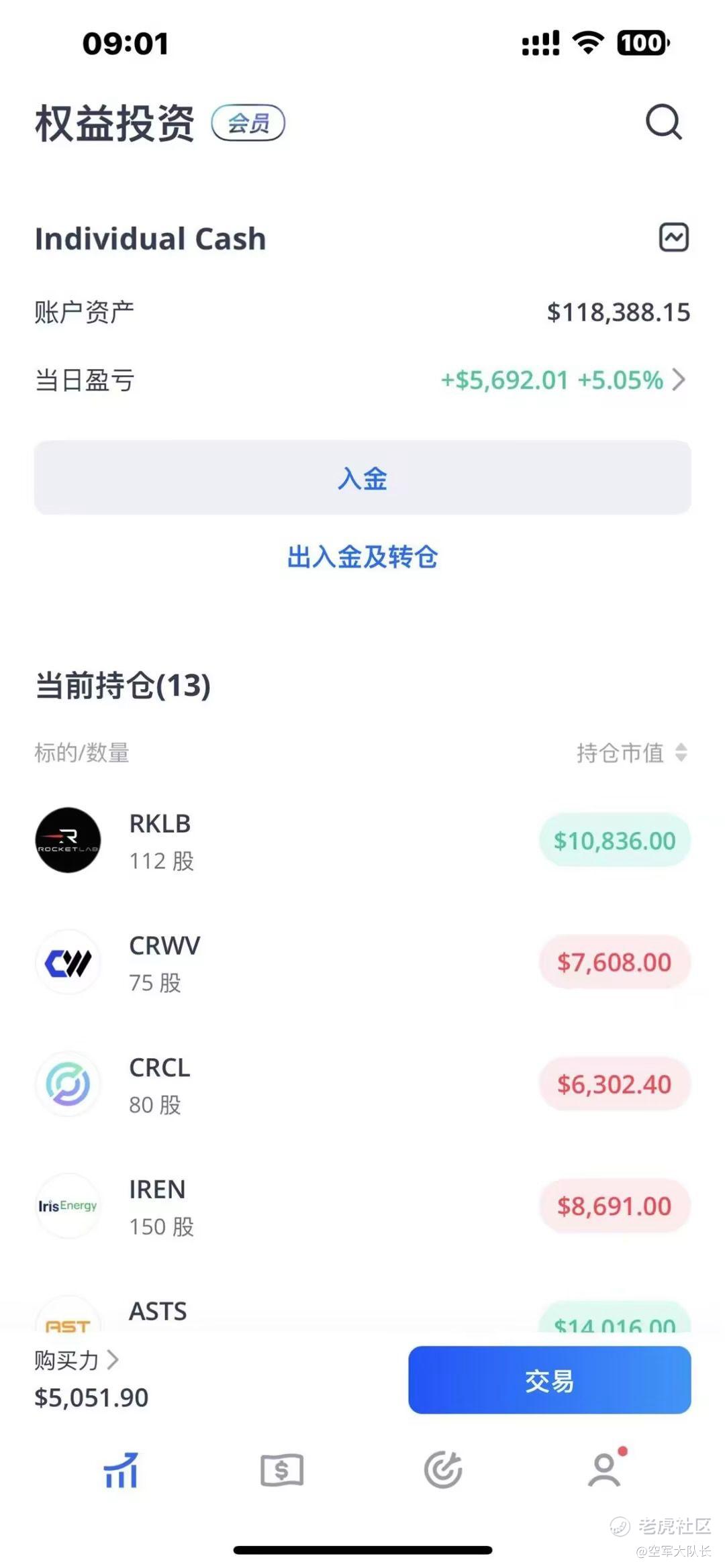 我的实盘账户已经到了11.8万美元,离12万美元也快了,RKLB我减仓了一点,其他的股票没有动,现在95%的仓位,我说了我实盘账户到了12万美元的时候,就要开始减仓,等我账户到了15万美元的时候就可以全部出来。