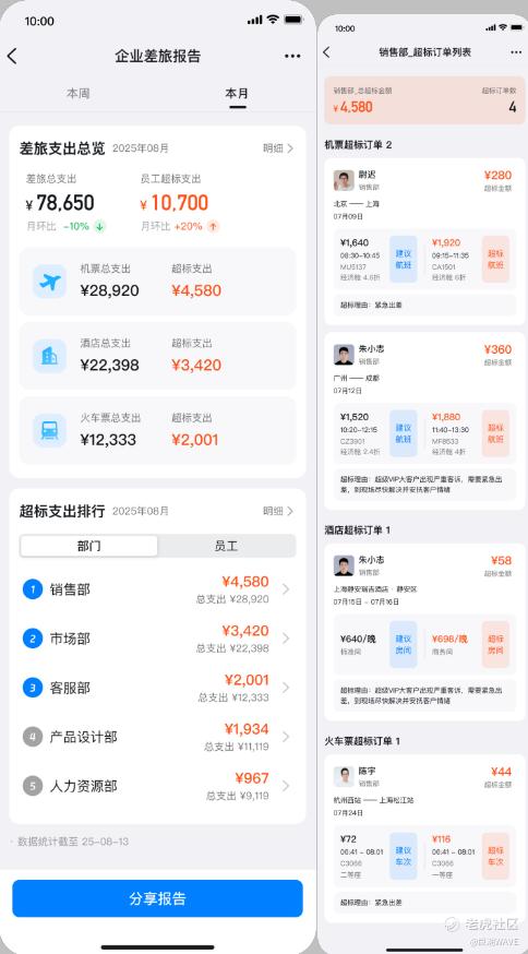 另一方面来自差旅支出的透明化。钉钉平台能自动生成差旅报告,自动统计超标预定的数据,可按部门、员工查看排行榜及明细,差旅花费透明可控,让管理者心中有数。