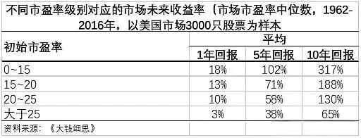 如果初始市盈率的中位数不到15倍,10年期的回报率是317%,大于25倍时,这个回报率降到了65%。