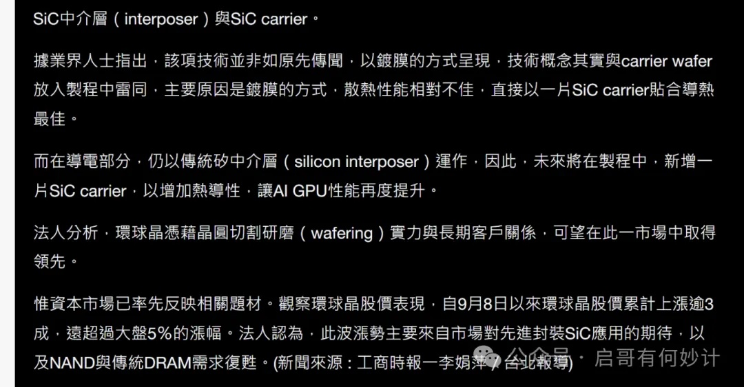 因此最近二级市场市场吹的这个碳化硅替代硅作为cowos中间层,几乎可以断言,属于具备巨大的技术逻辑漏洞,不值得信。(作者:启哥有妙计)