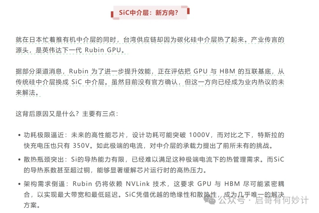 最后我们再回到实际上,NV确实动过相关的心思,他们评估过碳化硅的替代硅作为cowos中间层的方案,或者说他们希望TSMC们拿出更好的中间层高散热方案,压制未来NV GPU变态的功耗和发热。