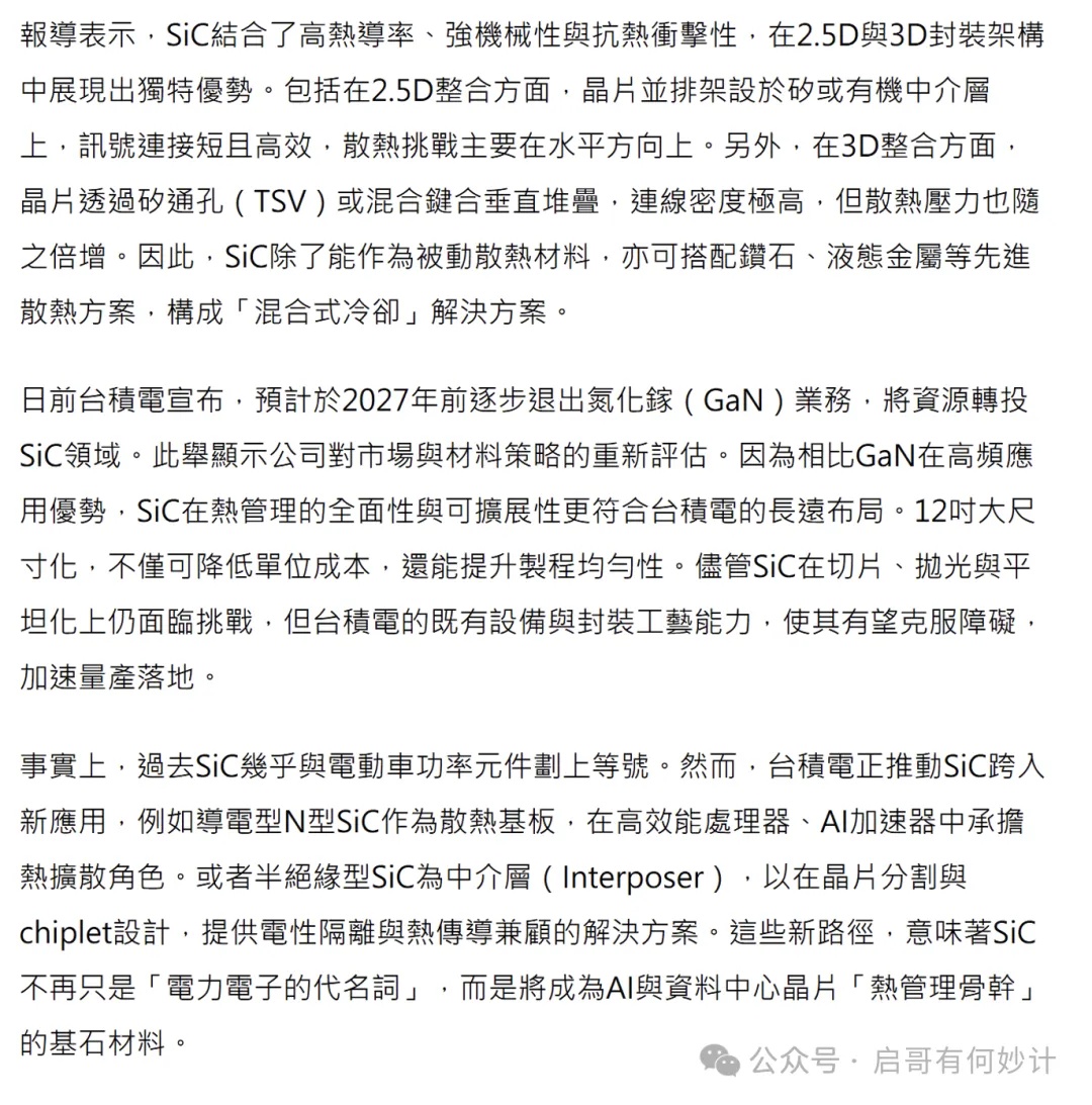 昨天质疑碳化硅的文章,引起激烈争论。很多人搬出各种大公司高管的论调,说你看你看,XX公司都说了,我们都进入TSMC了,马上Cowos上硅中间层都不用了,要用碳化硅衬底做中间层了。