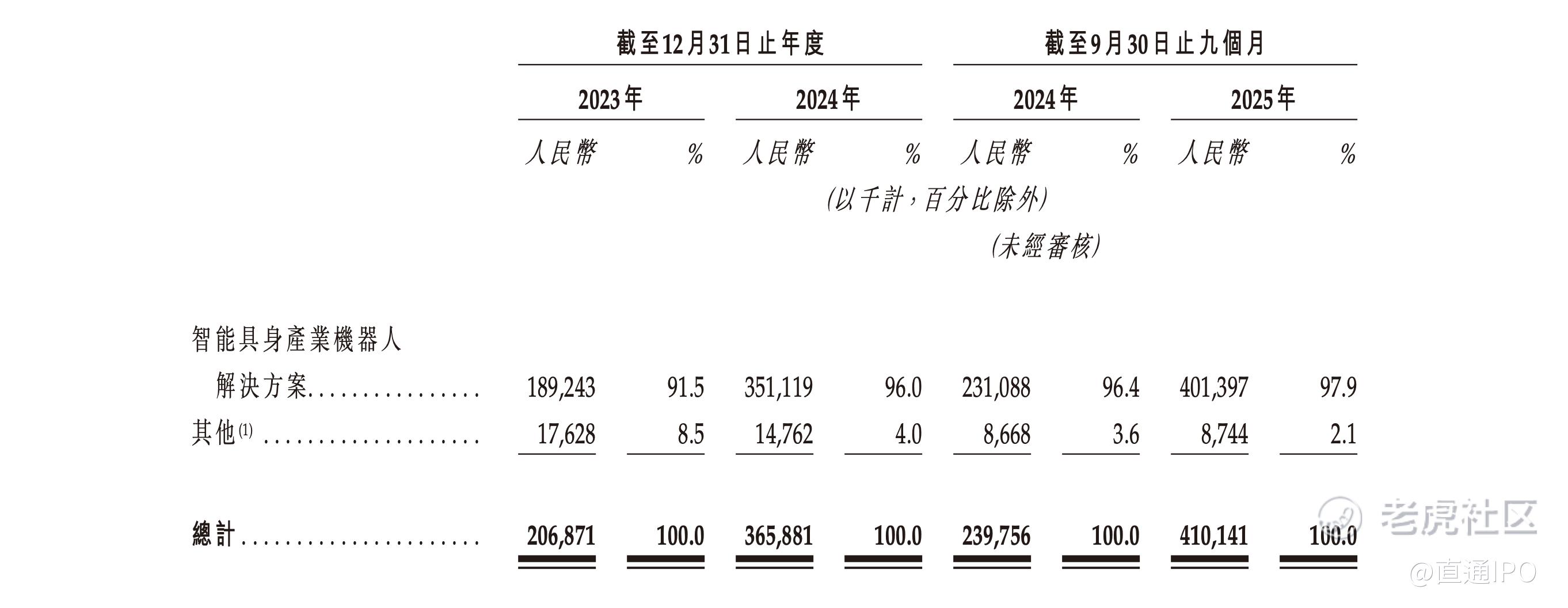 招股书显示,2023-2024年及2025年前三季度(下称:报告期),玖物智能来自智能具身产业机器人解决方案的收入分别约1.89亿、3.51亿、4.01亿元,占比分别为91.5%、96.0%、97.9%;来自其他业务(主要为机器人零部件销售)的收入分别约1762.8万、1476.2万、874.4万元,占比分别为8.5%、4.0%、2.1%。