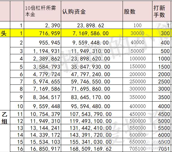 这个票一手金额23890元,一手认购金额是够高的,甲尾478万,乙头需要认购资金717万,乙组的各档融资所需要的本金还有融资金额对应如下表: