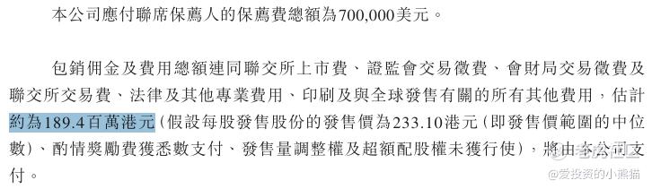 然后这个票招股书上按发售价范围的中位数233.10港元计算,公开的上市所有开支总额约为1.89亿港元,募资额约32.87亿港元,占比约5.76%,开支相比募资额算是比较少了。