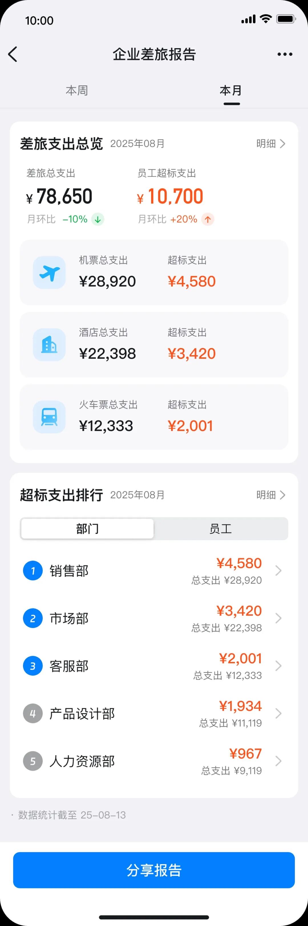 甚至,钉钉还支持自动生成差旅报告,自动统计超标预定的数据,可按部门、员工查看排行榜及明细。八姐觉得啊,这显然有助于减少内部腐败呐。