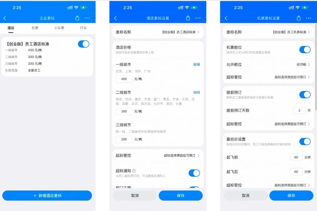 借助差旅应用的能力,中小企业的财务、hr等人员可以省心多了。企业可以通过钉钉差旅设置自己的差标,包括机票提前预订时限、酒店价位区间、火车票等级等,超标自动提醒,费用透明可控。