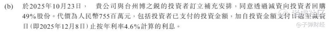 2025年10月23日,博锐生物与子公司台州博之锐的投资者签署补充协议,公司将以减资方式斥资7.55亿元回购对方持有的台州博之锐49%股权。该笔回购款涵盖原始投资本金,以及4.6%的年利率等。
