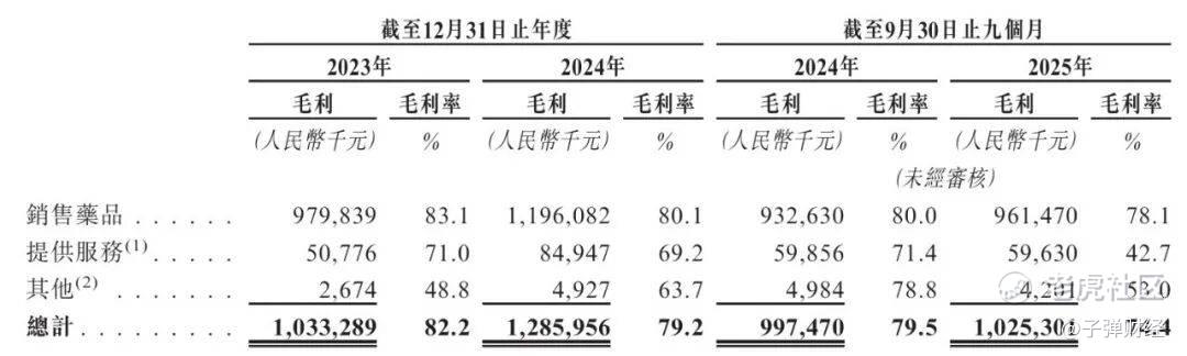 这一变化的背后,是两大核心因素的共同作用。一方面,低毛利服务收入占比提升,带来结构性拖累。2023年至2025年前三季度,低毛利服务收入在总营收中的占比由5.7%攀升至10.1%,其中比奇珠单抗推广服务的毛利率仅为42.7%,显著低于药品销售业务80%左右的盈利水平,直接拉低了公司整体毛利率。