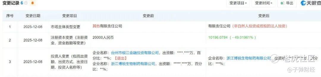 天眼查信息显示,2025年12月8日,持有台州博之锐49%股份的原股东——台州市椒江金融投资有限公司(实际控制人为台州市椒江区国有资产监督管理委员会)完成退出,而对于此次国有股东退出的具体原因,博锐生物招股书中并未披露。