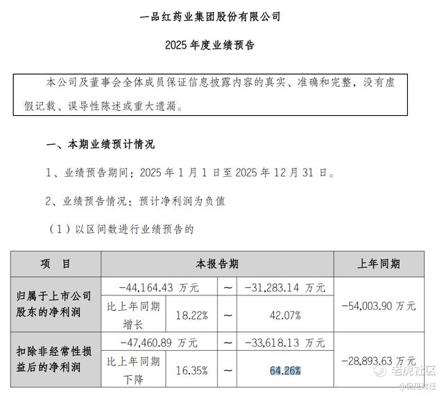 近期,一品红 $一品红(300723)$ 发布了2025年全年业绩预告,预告显示,预计2025年净亏损3.13亿元至4.42亿元,同比增长18.22%至42.07%,据悉去年同期亏损金额为5.4亿元;扣非净亏损为3.36亿至4.75亿元,同比下滑16.35%至64.26%,去年扣非亏损金额为2.89亿元。