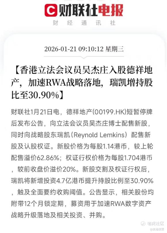 1.70 港元的行权价、一年禁售承诺,这两个细节直接暴露了瑞凯的野心 —— 它要的不是短期股价波动的利差,而是德祥地产转型后的绝对话语权。说白了,这是一场用高成本换时间、换确定性的资本豪赌,赌的就是 RWA 赛道爆发后,这家公司的价值重估。要知道,在港股玩壳重组,最值钱的从来不是壳本身,而是壳背后的资源整合能力和赛道想象力。
