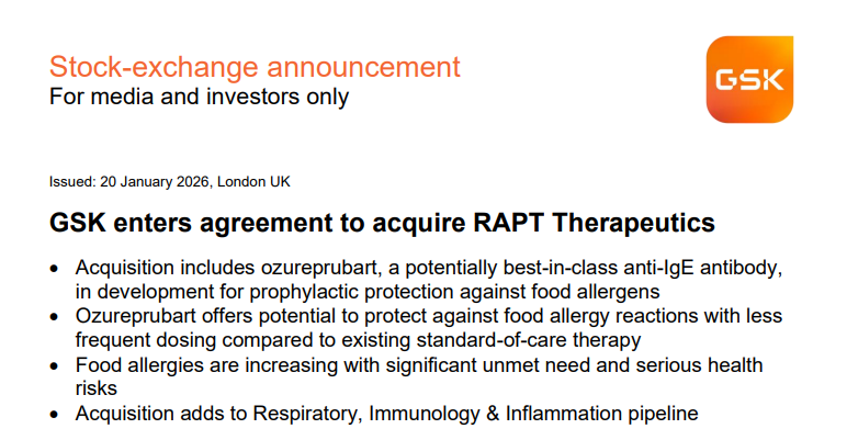 今天,葛兰素史克GSK宣布以22亿美元价格收购美国上市药企RAPT Therapeutics,获得其核心产品ozureprubart,长效抗免疫球蛋白E(IgE)单克隆抗体,目前正处于IIb期临床开发阶段,主要用于食物过敏的预防治疗和荨麻疹。