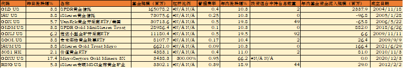 黄金矿业ETF,如 $黄金矿业ETF-VanEck(GDX)$ 、 $小型黄金矿业ETF(Market Vectors)(GDXJ)$ 、 $iShares MSCI Global Gold Miners ETF(RING)$ ,底层资产是金矿股,弹性较大,又不失稳重。