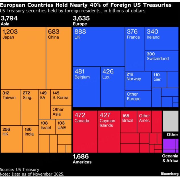 欧洲是美债第二大持有者,仅次于亚洲,占比40%: