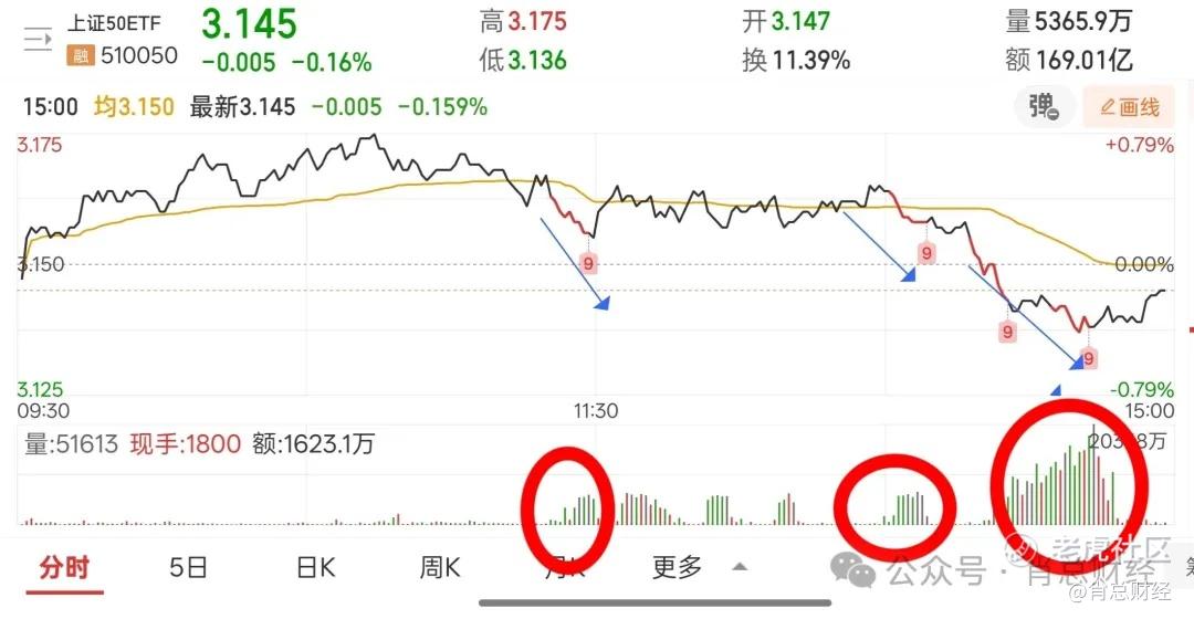 这是今天场内最大宽基上证50etf的分时走势,我画的剪头走势对应的分时量能。