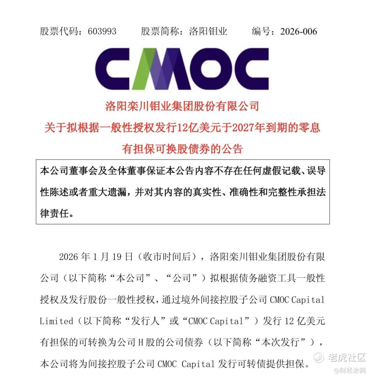 公司情报专家《财经涂鸦》获悉, 1月20日,洛阳钼业发布公告,宣布总额为12亿美元的1年期零息可转换债券(简称“零息可转债”)顺利完成发行。