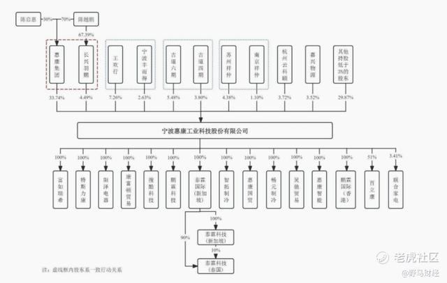 陈越鹏之父陈启惠通过惠康集团,间接持有惠康科技10.12%股份;其女陈思思担任公司董事、投资总监,并未持有公司股份;其妹陈月琴担任采购中心总监,并通过长兴羽鹏间接持股0.63%。此前,陈越鹏配偶劳秋娣还于2022年1-5月曾担任公司财务人员。
