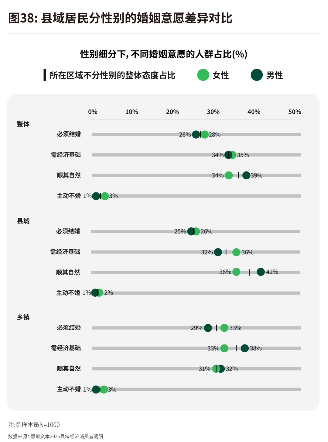 乡镇的环境中,认为“必须结婚”的传统压力(男29.2%,女32.9%)都高于县城水平,乡镇男性展现出更深的经济焦虑,对“需要经济基础”的诉求(37.7%)最为强烈,高于女性。但乡镇女性“主动选择不结婚”的比例(2.9%)是男性(0.8%)的三倍有余。