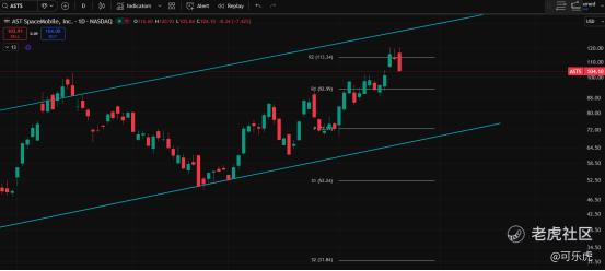 二十三、ASTS 今晚下跌,可能要回到支撑92附近。短期内会有震荡调整,最高目标可能是132.
