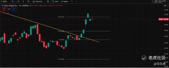 27、GLXY(优)站稳33会很强。已突破黄色压力线,今晚也有回调,只要在27.6之上就还算安全。