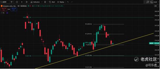 五、AMZN: 黄色斜线是支撑,短期的230支撑也强不跌破225就没事。财报:2026年2月5日盘后