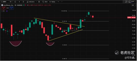 十一、CRWV:(优)在102遇阻,不过不用担心,还能冲。突破挤压形态了。短期内87.2、81.3的支撑很强。