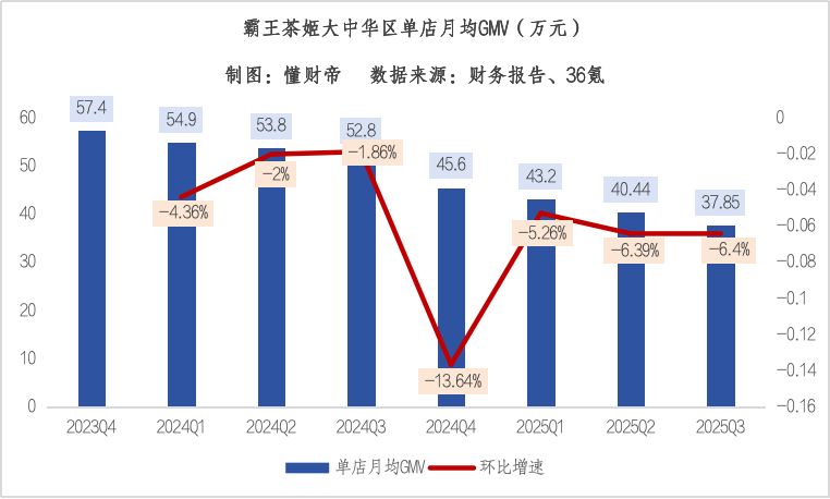 作为估值锚,2025Q3,大中华区单店月均GMV下滑至37.85万元,已连续7个季度承压。