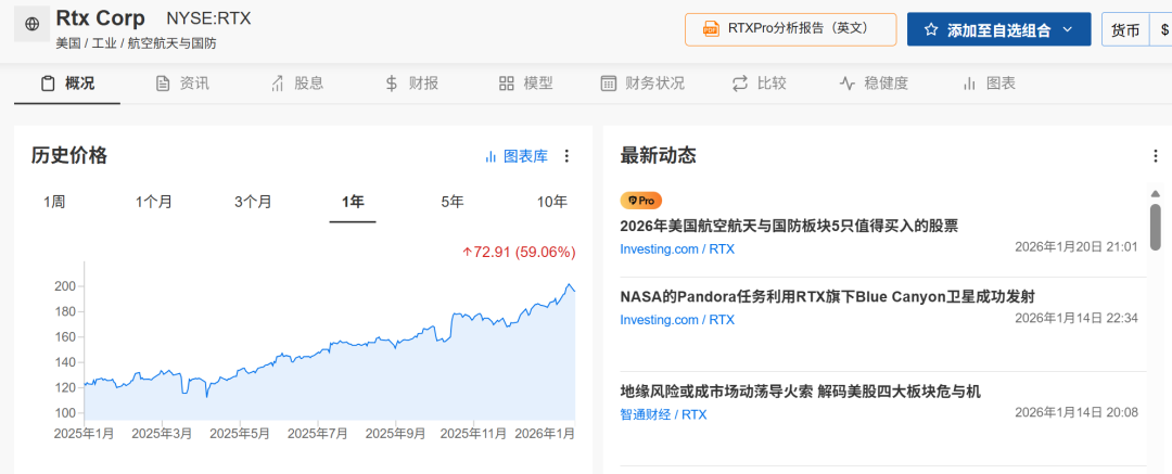 RTX股价在2025年上涨60%的基础上,2026年迄今再涨约7%,创纪录的2510亿美元订单储备为其提供支撑。