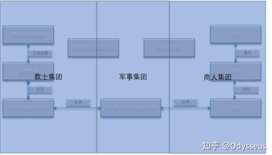 第二点体现在伊朗的行政制度设计上,伊斯兰法学家占据了金字塔的顶端,而他们分享权力给了文官机构和军事机构。在很多年之前,我曾经画过下面这个图