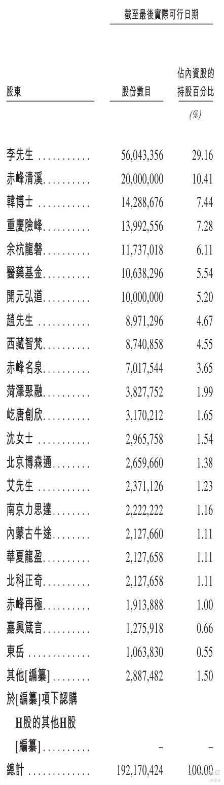 IPO前,李雨亮有权行使公司已发行股本总额约43.22%所附带的投票权,其中包括:李雨亮(以个人身份)拥有已发行股本总额约29.16%的权益;及透过赤峰清溪及赤峰名泉控制公司约14.06%投票权,赤峰清溪及赤峰名泉分别持有约10.41%及3.65%股份。