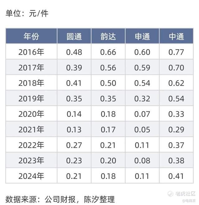 在经历十多年高速增长后,快递行业普遍进入“微利时代”。《财经》统计数据显示,2016至2024年间,中通单票平均毛利从0.77元降至0.41元,圆通由0.48元跌至0.21元,韵达从0.66元降到0.18元,申通则从0.60元滑落至0.11元。