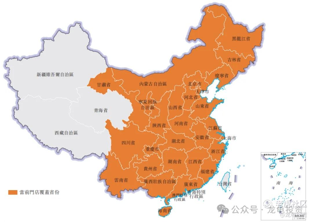 鸣鸣很忙截止到2025年9月30日,自营店就23家,其余19494家全部是加盟店,其中零食很忙8407家,占比43.1%;赵一鸣零食11087家,占比56.8%;总计19517家,较上一年14394家,增长了5123家,增长率35.59%。公司门店网络于中国的布局图: