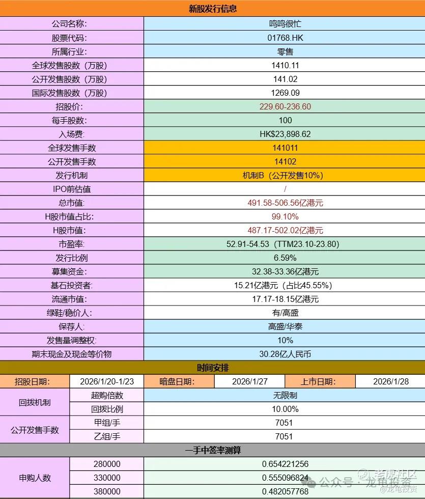 全球发售股数1410.11万股,每手股数100股,入场费23898.62港元,这个门槛不是一般高,明显不想与散户为伍,赚百姓的钱,没百姓的份,这很资本主义。本次采用机制B发行,甲乙组各分7051手,一手中签率0.5%,全员抽签!