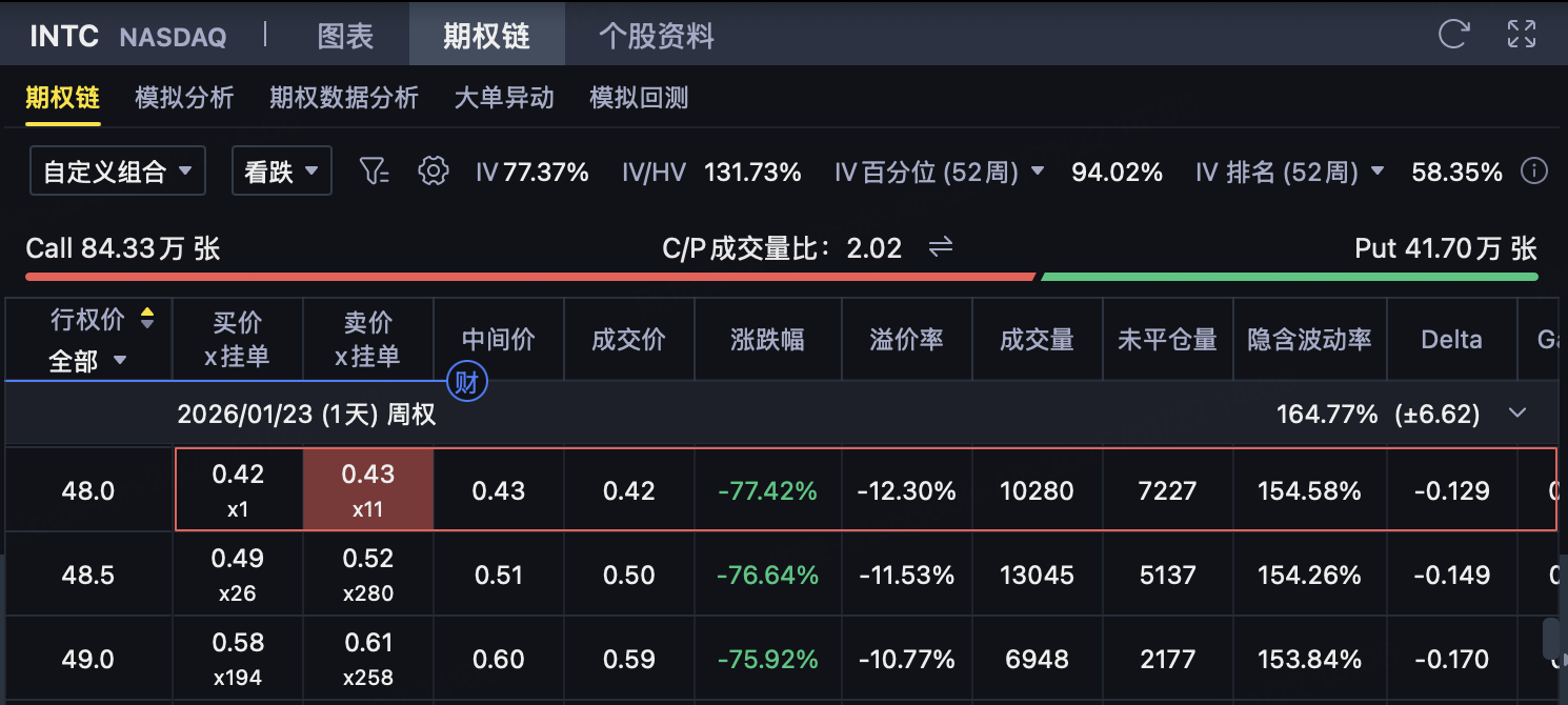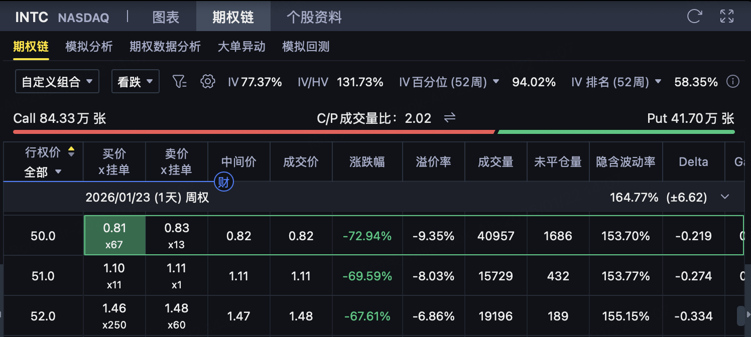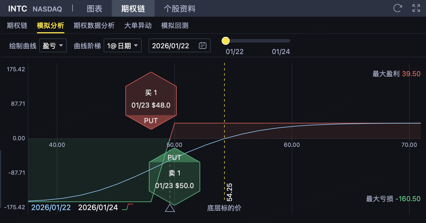 该 Put 更接近当前股价,是策略的主要权利金来源。 只要 INTC 到期价格 ≥ 50 美元,该 Put 将完全失效,投资者可保留全部权利金。