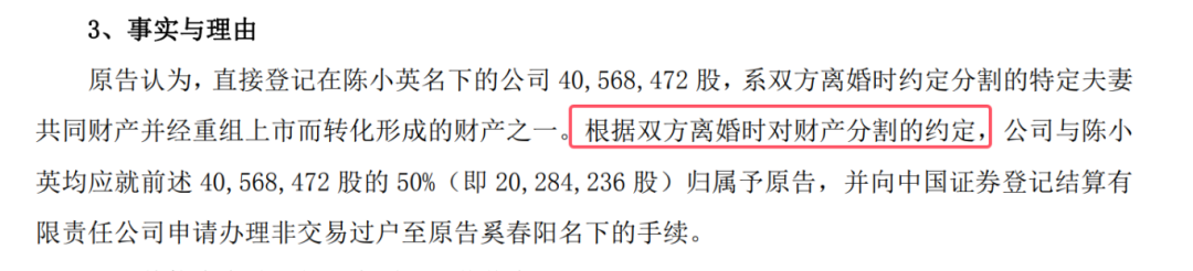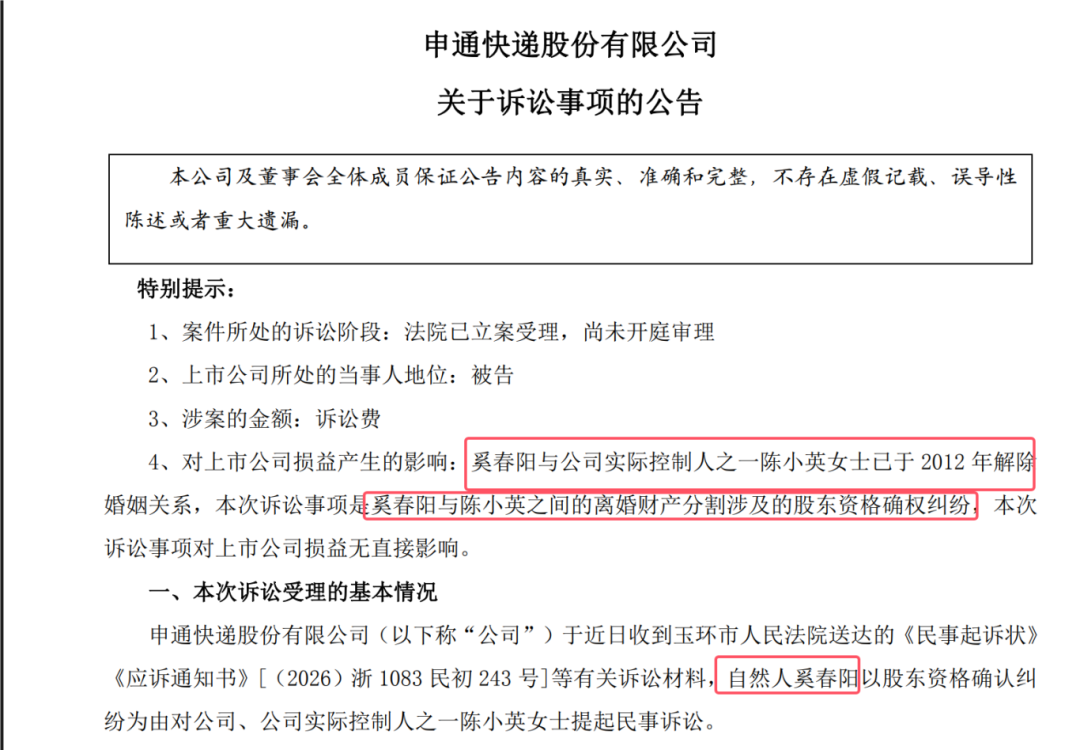 尽管婚姻早已结束,但财产分割问题似乎并未彻底厘清。2026年1月22日,申通快递发布公告披露,奚春阳向浙江省玉环市人民法院提起诉讼,请求确认登记在陈小英名下的40,568,472股申通股票(占公司总股本2.65%)中的一半(即20,284,236股,约1.33%)归其所有,并要求办理非交易过户手续。奚春阳主张,这部分股份源于双方婚姻存续期间的夫妻共同财产,且在2012年离婚时已达成分割协议,只是因后续申通借壳艾迪西上市,股权结构发生变化,相关股份一直登记在陈小英名下,未能及时过户。如今时隔十余年提起诉讼,或与当前股价高位、资产价值凸显有关,也可能源于近年协商未果后的法律救济选择。