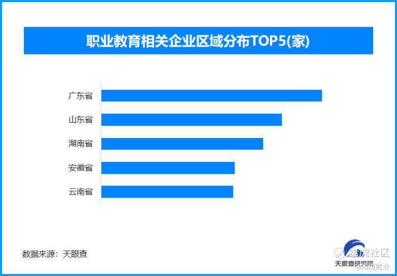 天眼查专业版数据显示,截至目前我国现存在业、存续状态的职业教育相关企业超1万家。其中,2025年新增注册相关企业约340余家。从区域分布来看,广东省、山东省、湖南省职业教育相关企业数量位居前列,分别拥有超1100余家、950余家和850余家。
