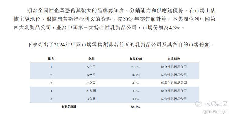 例如招股书援引弗若斯特沙利文的资料,按中国市场零售额计算,2024年,君乐宝位列中国低温液奶市场第二位,市场份额达14.5%;中国鲜奶市场第三位,市场份额达10.6%;中国低温酸奶市场第二位,市场份额达17.2%;在2020年至2024年,公司连续五年位列本土婴幼儿配方奶粉企业前三,2024年市场份额达5.0%。