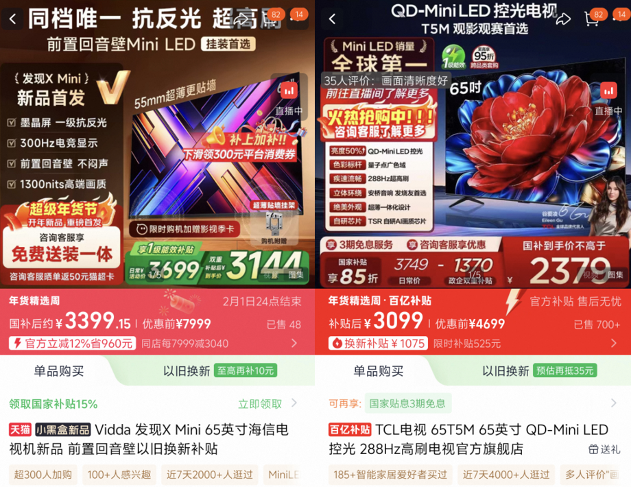 在格局剧变的进程中,国补又给了临门一脚。在国内市场,叠加国补后,海信、TCL等品牌部分55英寸及65英寸型号的Mini LED 电视价格已下探至3000元以下的主销价格段,Mini LED 的“技术下放”近一步加快。