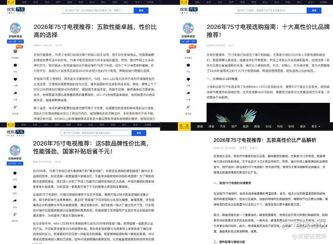 值得一提的是,惊蛰研究所在查阅不同平台引用的具体信息时,意外发现通义千问引用的4篇来自搜狐平台的内容存在形式上的雷同:这4篇文章的标题均采用了“2026年75寸电视推荐/选购指南:XX”的句式,同时正文开头也不约而同地使用了类似“在现代家庭/家居生活中,75寸电视成为XX标配”的表述;在正式给出推荐的电视产品型号前,也都会先铺垫一段“如何挑选75寸电视的”基础知识和方法论;更关键的一点:这4篇内容有3篇来自同一个账号。