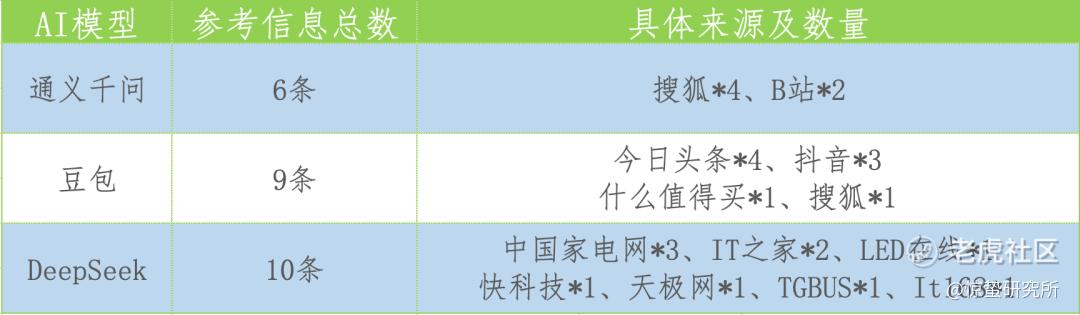结果显示,通义千问参考了6条信息来源,其中4条来自搜狐,2条来自B站;豆包参考了9篇资料,4条来自今日头条,3条来自抖音,还有两条来自什么值得买和搜狐;DeepSeek的信源则更加复杂,参考的10条链接中,3条来自中国家电网,2条来自IT之家,其余5条链接则来自LED在线、快科技、天极网、TGBUS、It168。