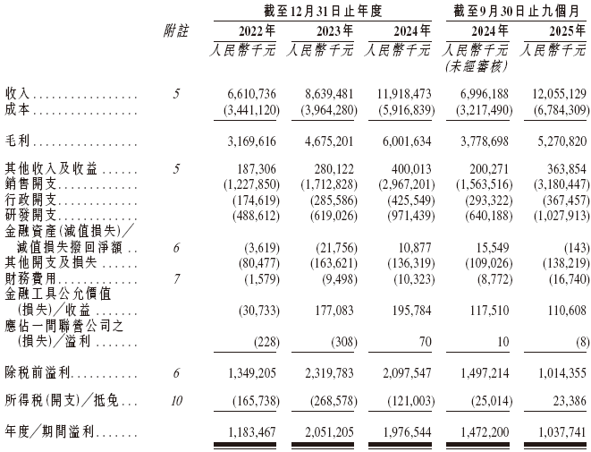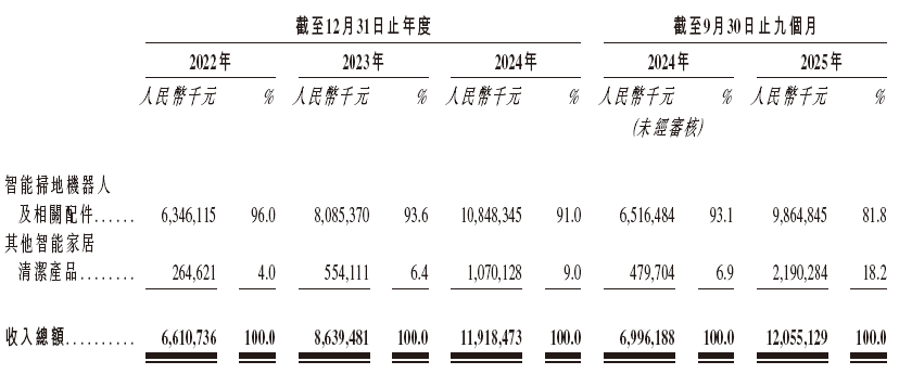 招股书显示,在过去的2022年、2023年、2024年和2025年前九个月,石头科技的营业收入分别为人民币66.11亿、86.39亿、119.18亿和120.55亿元,相应的净利润分别为11.84亿、20.51亿、19.77亿和10.38亿元。