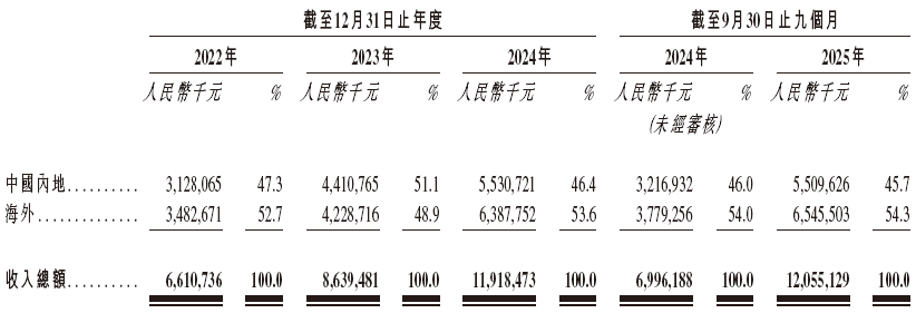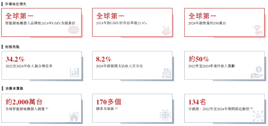 截至2025年9月30日,石头科技的产品已在15个石头科技官方商城、全球主要电商平台上的96家自营店发售,公司在全球拥有178家分销商,用户群遍布全球逾170个国家和地区。于2024年及2025年前九个月,石头科技海外收入占比约53.6%、54.3%。