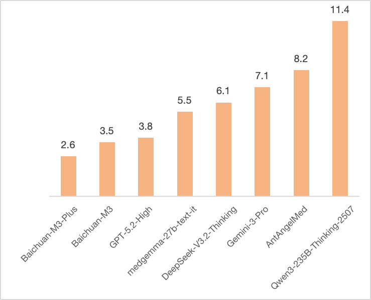 凭借百川独创的六源循证技术与M3基座结合,M3 Plus将幻觉率降低至2.6%,低于Open Evidence。