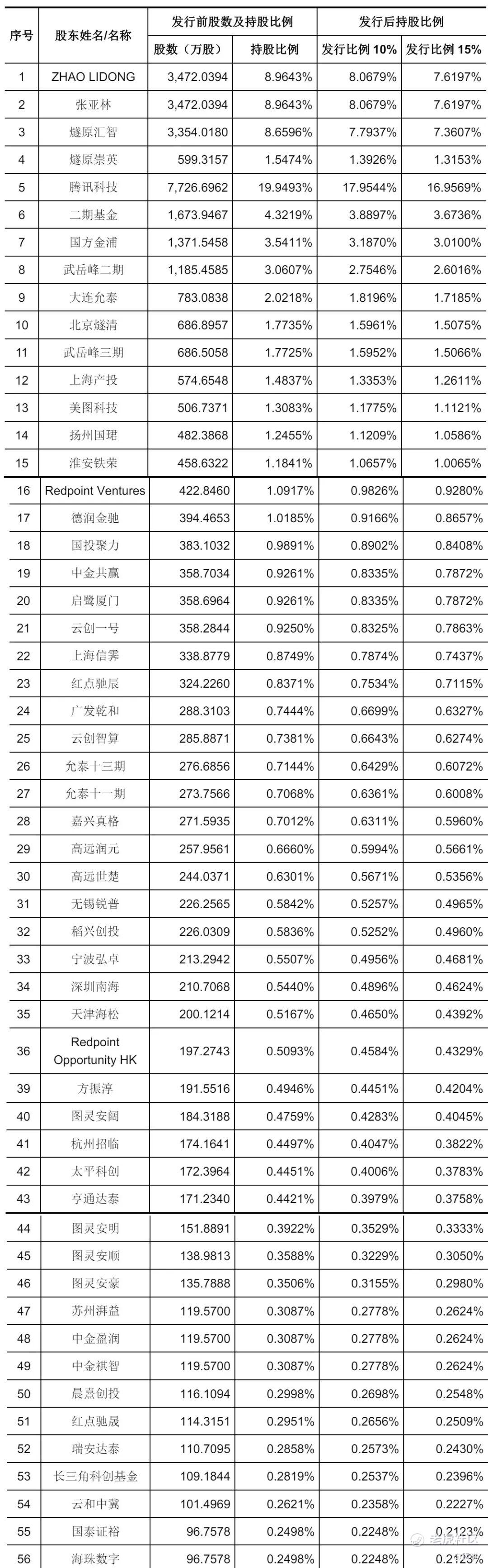 IPO后,ZHAO LIDONG、张亚林分别持股为7.6197%,燧原汇智持股为7.3607%,燧原崇英持股为1.3153%,腾讯科技持股为16.9569%,二期基金持股为3.6736%,国方金浦持股为3.01%,武岳峰二期持股为2.6016%,大连允泰持股为1.7185%,北京燧清持股为1.5075%,武岳峰三期持股为1.5066%;